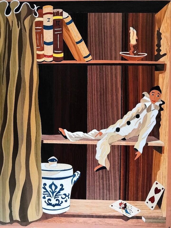 "Shopping" Marqueterie contemporaine mesurant 12cm x 32cm.