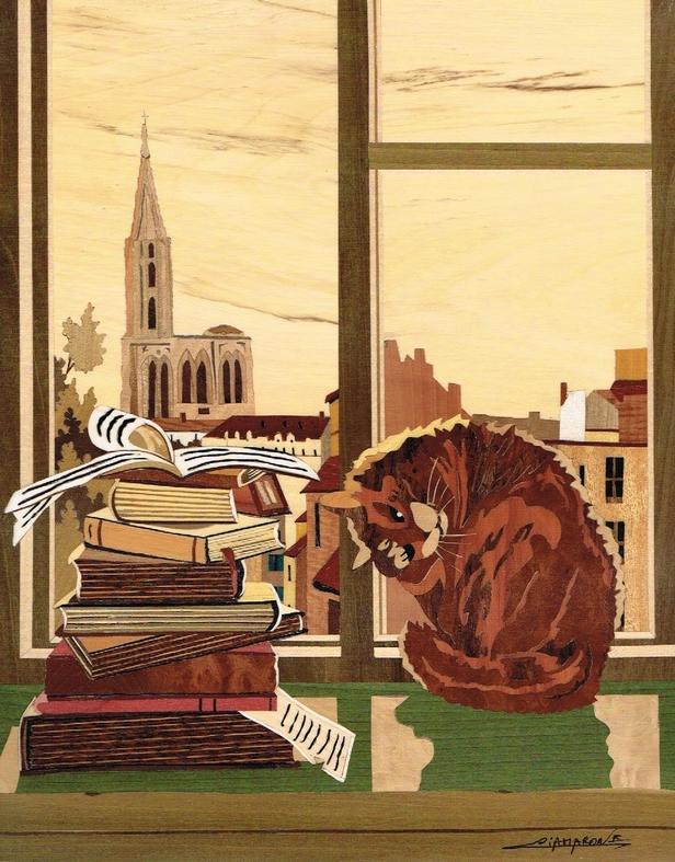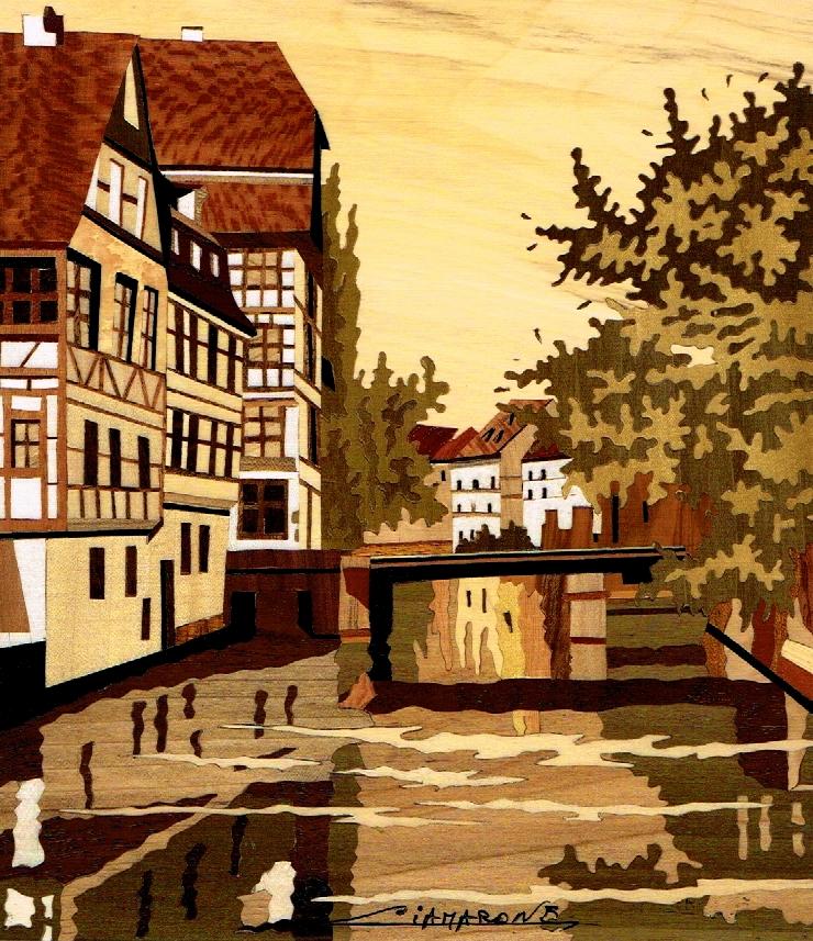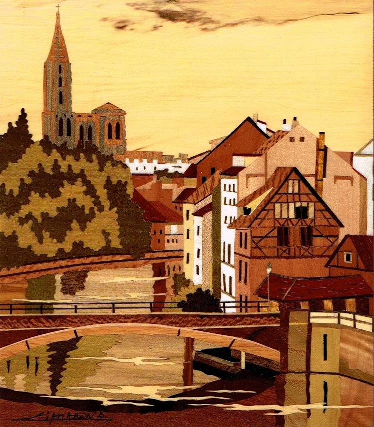 "Balade à Strasbourg" 22cm x 27cm environ avec son encadrement Cette marqueterie réalisée avec plusieurs variétés de bois naturel venant de différents pays.