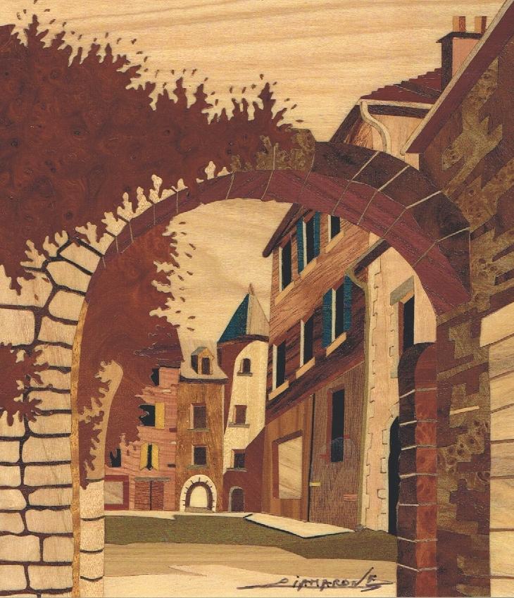 "Vezelay" Marqueterie 22cm x 20cm environ avec son encadrement Cette marqueterie réalisée avec plusieurs variétés de bois naturel venant de différents pays.