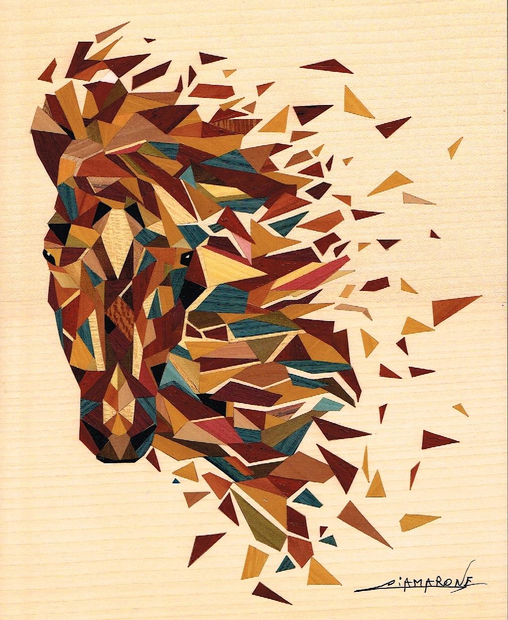 "cheval Fougueux" œuvre 38cm x 32cm environ réalisée avec plusieurs essence de bois naturel et teintés réalisée entièrement à la main dans mon Atelier à Crémieu...Made in France